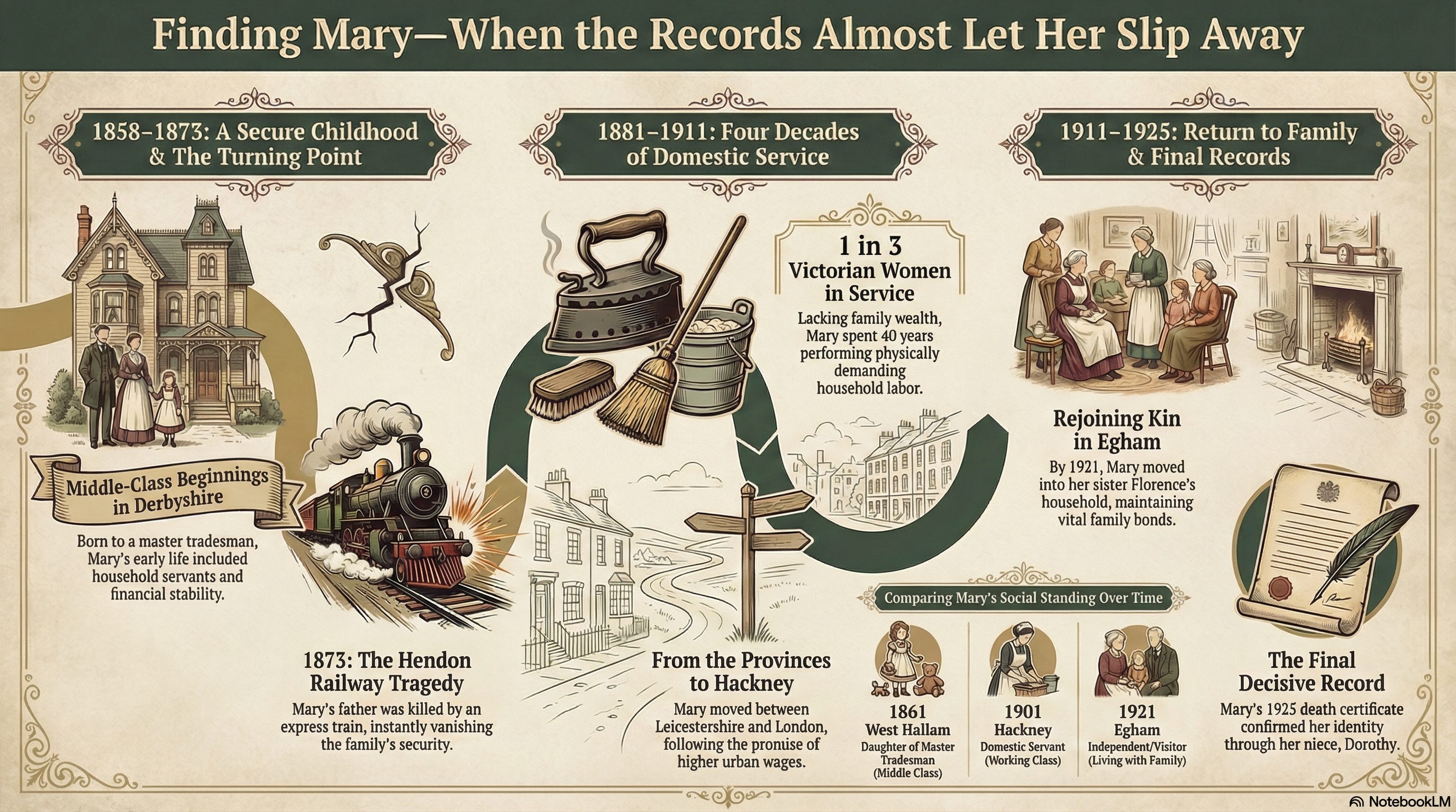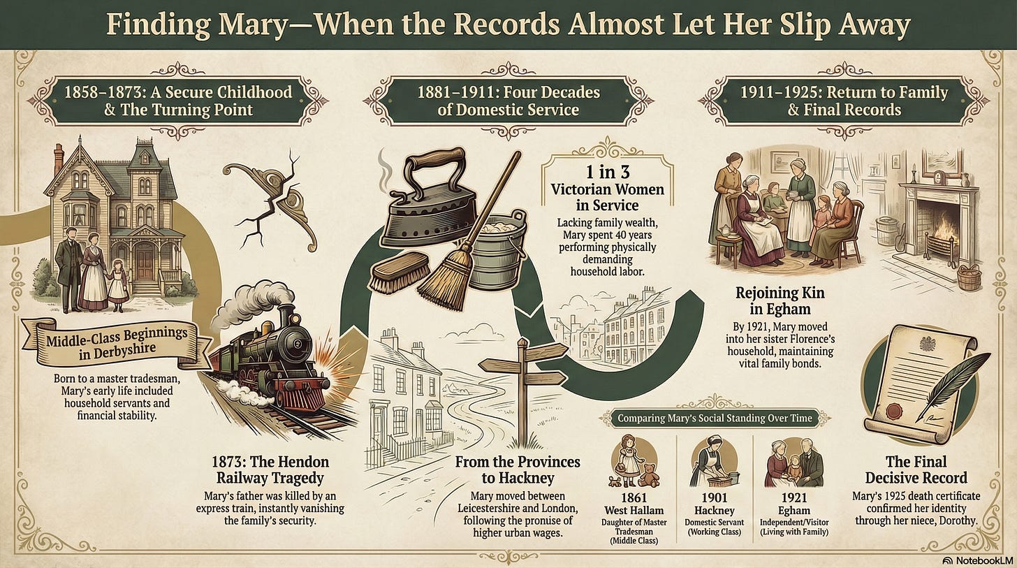It took careful analysis of every address, every occupation, every family connection—and yes, the help of AI to spot patterns I might have missed—to confirm I was following the right woman across seven decades. Each record had to align perfectly with the next. Was this Mary the right age? In the right place? Connected to the right family?