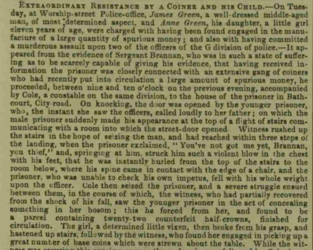 It told the story of a man named James Green, described as “a well-dressed middle-aged man, of most determined aspect,” and his eleven-year-old daughter Anne, charged with manufacturing counterfeit coins and assaulting two officers of the G Division of the Metropolitan Police. The article was dramatic, detailed, and utterly gripping.