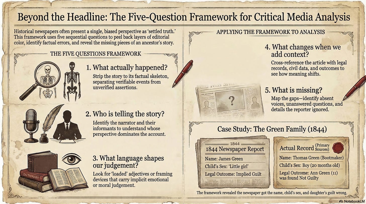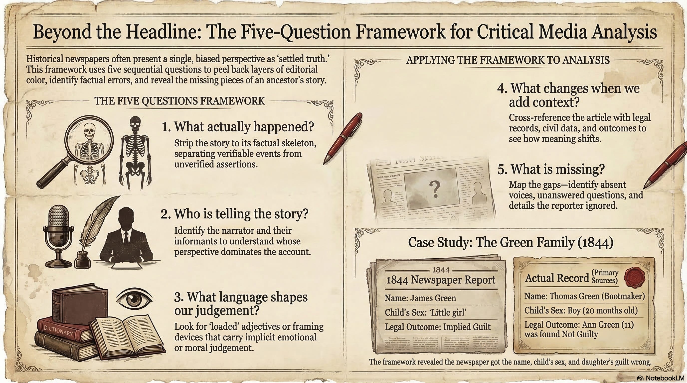 The five questions are not complicated. They don’t require specialist training. You can apply them to a newspaper article, a court record, a parish register, or an immigration document. They simply ask you to slow down and notice what the source actually says, who is saying it, how it says it, what changes when other evidence is added, and what remains unanswered.