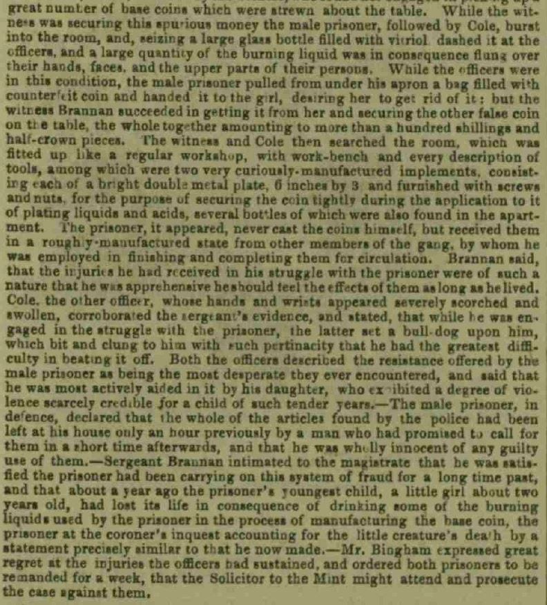 According to the article, Sergeant Brannan and Constable Cole went to the accused man’s house in Bath-court, City Road, between nine and ten o’clock on the evening of 23 December 1844. The daughter opened the door and called out to her father. The father appeared at the top of the stairs, shouted at Brannan, and kicked him down the staircase. A struggle followed. The daughter was caught concealing counterfeit half-crowns. The father seized a bottle of vitriol (sulphuric acid) and hurled it at the officers. The room was fitted out as a counterfeiting workshop. Both father and daughter were charged and remanded.